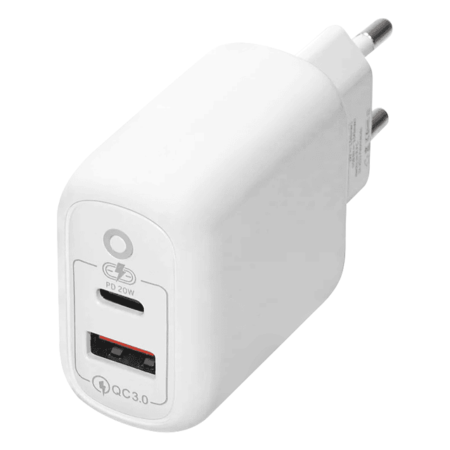 Este cargador incluye 1 puerto Tipo C Power Delivery de 20W. + 1 puerto USB 3.0 Quick Chargue, para cargar tus dispositivos de manera simultánea.